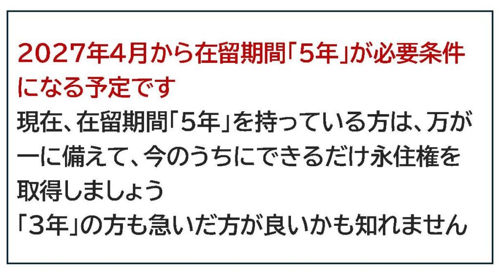 日本に長期にわたり滞在している方はより安定した資格である永住者ビザに切り替えることをお勧めします